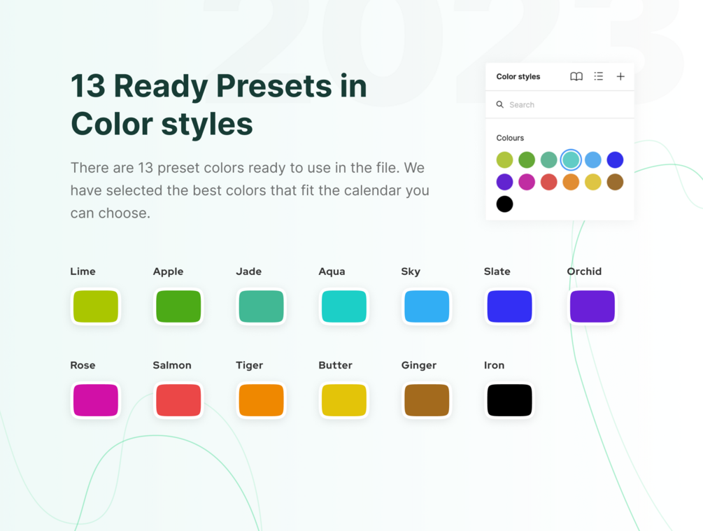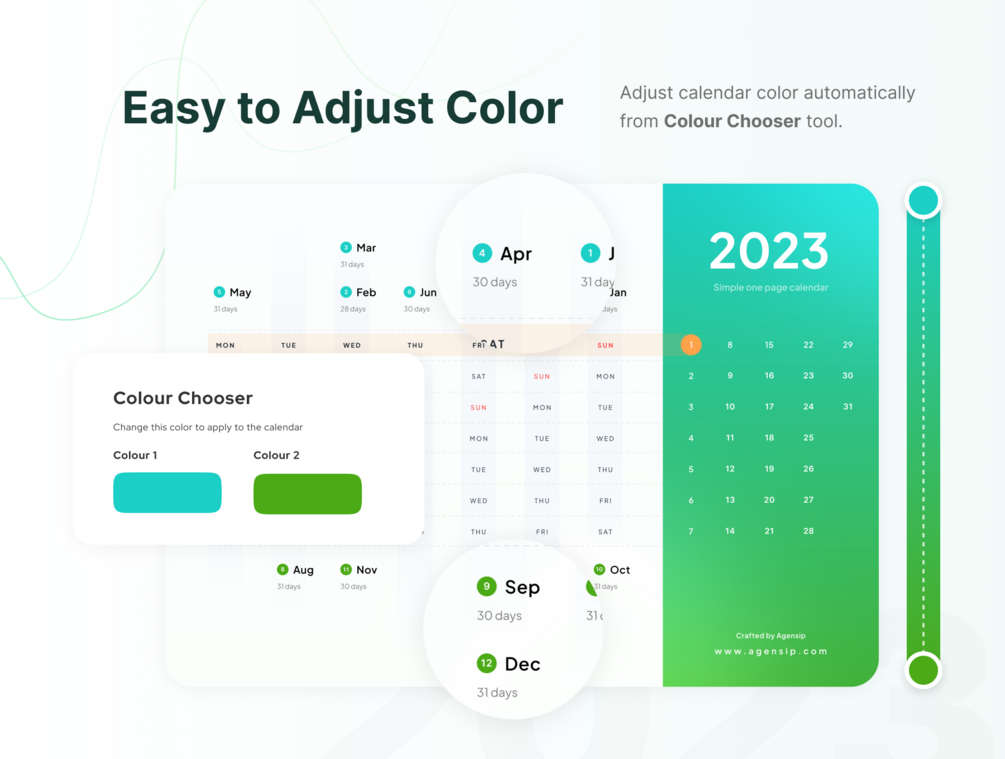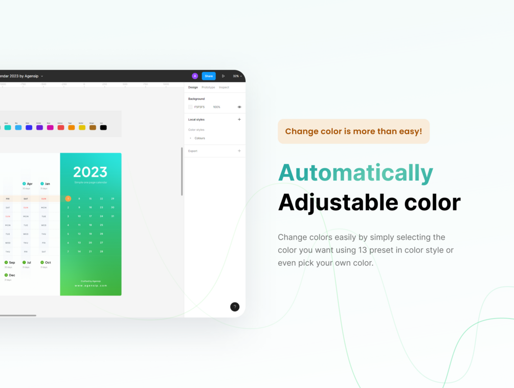 This Calendar has a great color chooser feature. You can automatically adjust the color in solid & gradient with the Colour Chooser tool inside the Figma file.