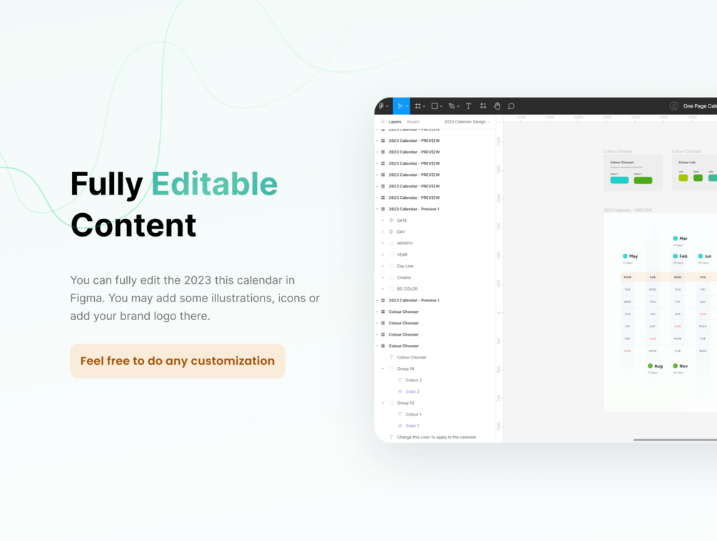 This Calendar has a great color chooser feature. You can automatically adjust the color in solid & gradient with the Colour Chooser tool inside the Figma file.