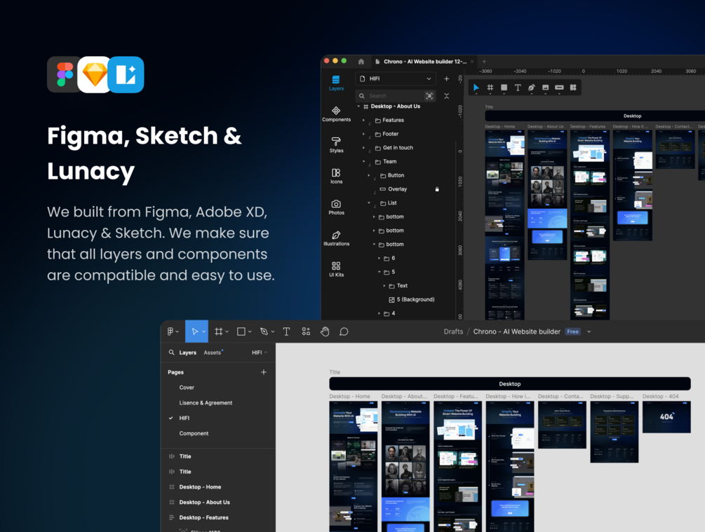 Dive into hassle-free customization with symbols and components that are meticulously organized and ready to use. Whether using Figma, Sketch, Adobe XD, or Lunacy, Chrono is versatile and user-friendly.