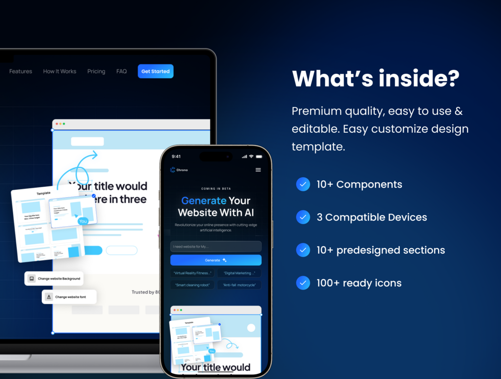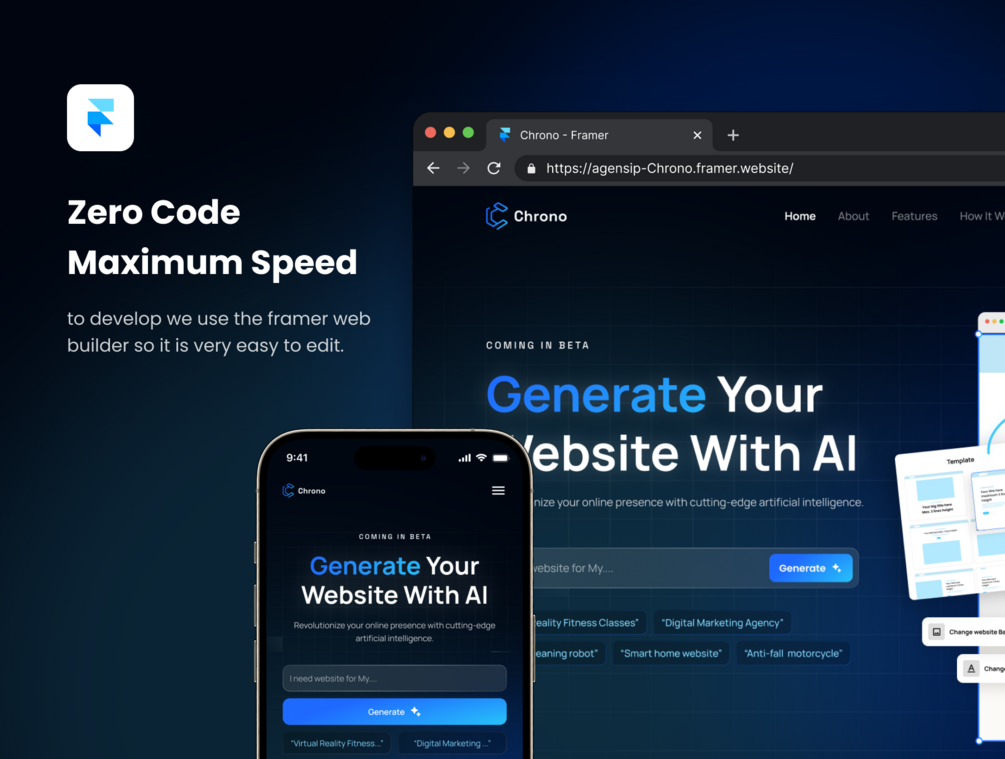 Available in both Pre-Designed Sections and Framer Templates, Chrono is tailored to meet the needs and established organizations operating website builders with AI service, as both digital technology companies and established organizations operate in the website development service. The template is 100% customizable & fully responsive to look beautiful on all devices.