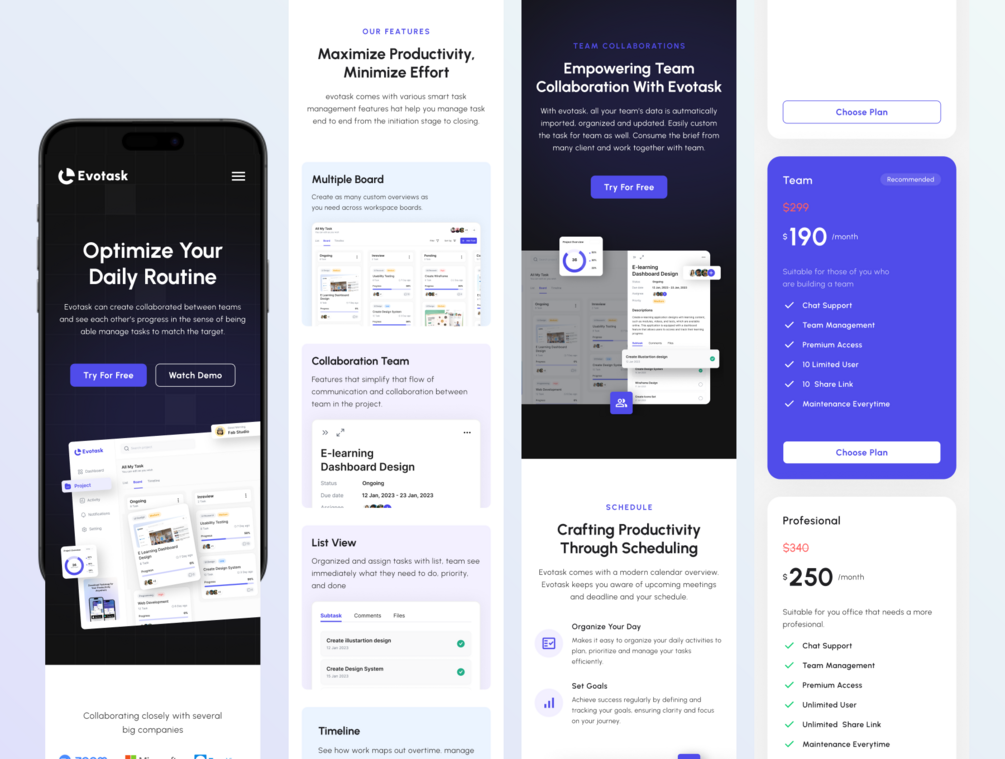 Evotask boasts a clean and modern design that ensures digital product service shines, professionally capturing the audience's attention and trust.