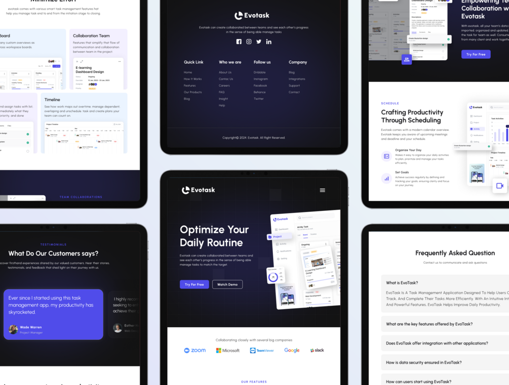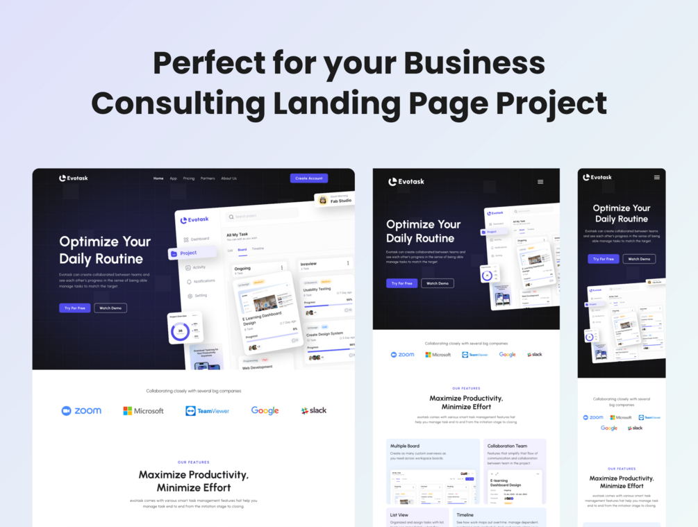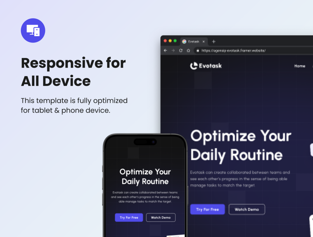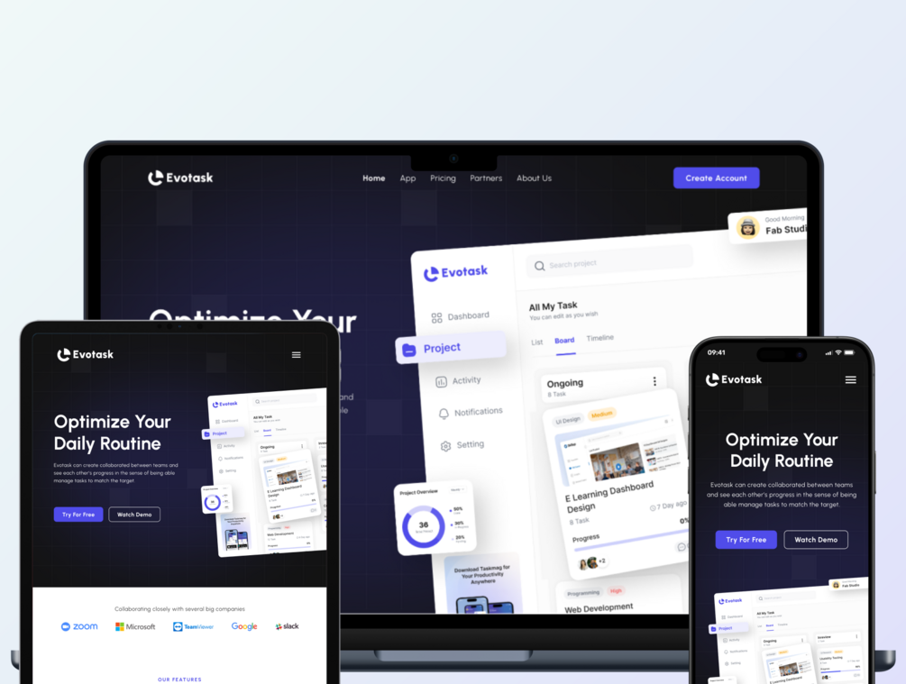 Explore the freedom of creating a website that seamlessly adapts to various devices. Evotask includes responsive tablet and mobile versions for a holistic online experience.