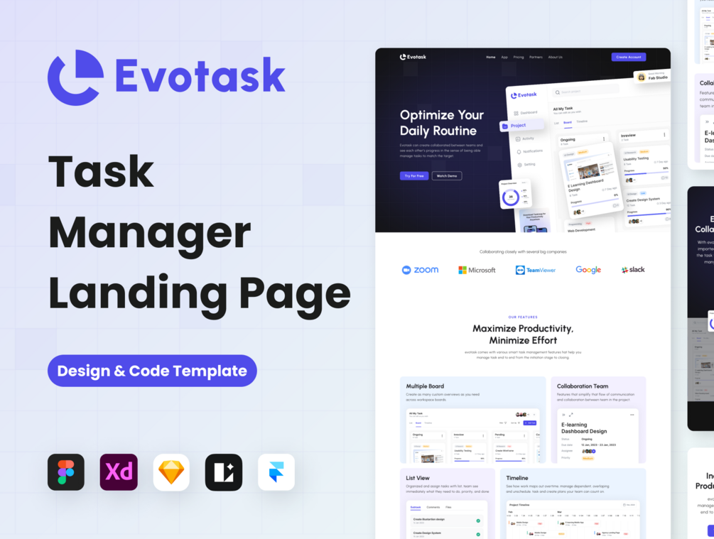 Evotask is a Landing page kit for digital product services, providers working majorly in the field of task manager digital products into various innovative. Evotask offers customized strategies, expert guidance, and strategic solutions tailored to represent the task manager sector across diverse digital product business activities.