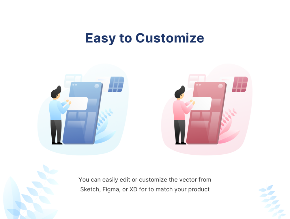 This illustration can be easily customized to match any color palette and style. Also, scale them to any size, or use prepared ready PNG, SVG, and PDF. And of course, you can open the original vector in Sketch, Figma, and Adobe XD.