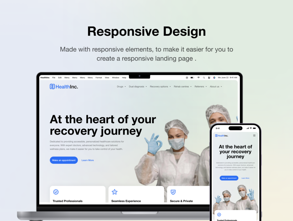📱 Responsive Design: Explore the freedom of creating a website that seamlessly adapts to various devices. Healthinc includes responsive tablet and mobile versions for a holistic online experience.