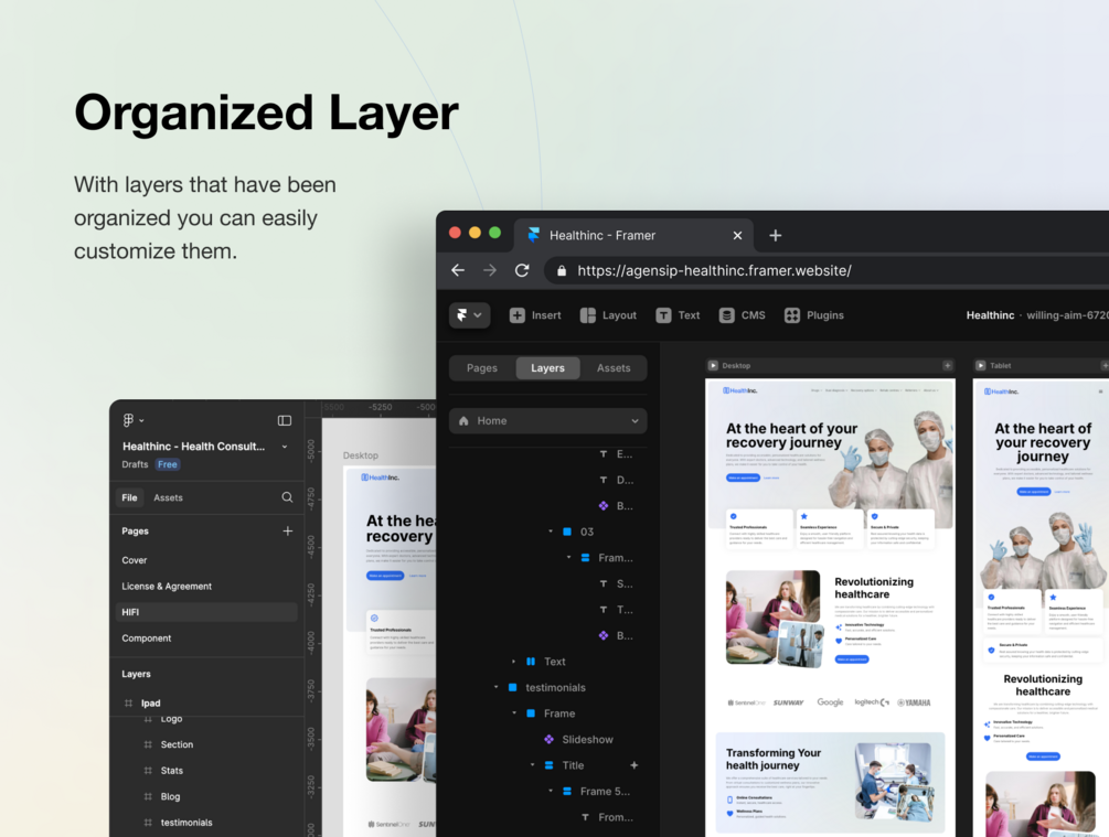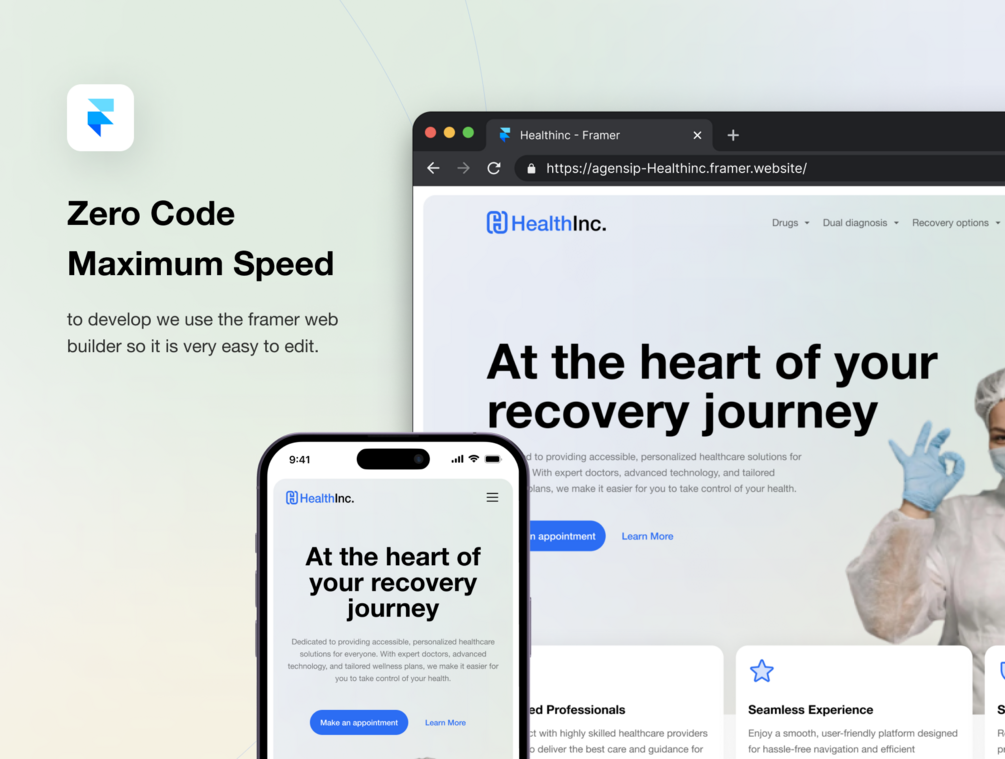 Available in both Pre-Designed Sections and Framer Templates, Healthinc is tailored to meet the needs of hospitals, healthcare, drugstores, and medical consultants services. The template is 100% customizable & fully responsive to look beautiful on all devices.