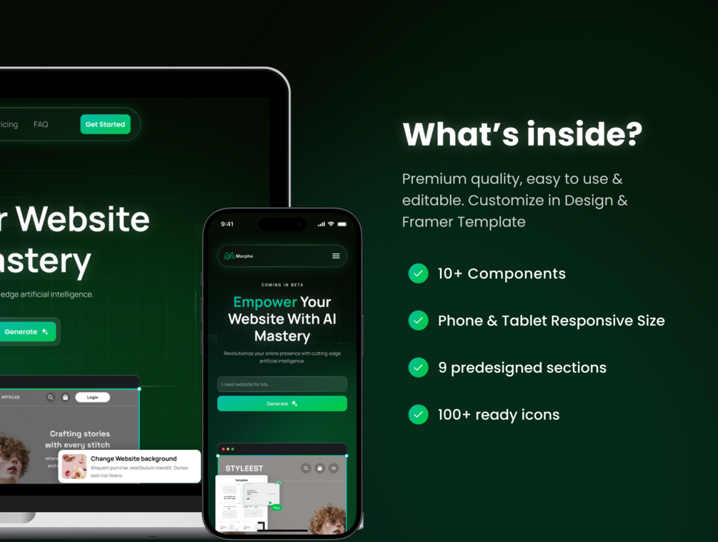 Available in both Pre-Designed Sections and Framer Templates, Morpho is tailored to meet the needs and established organizations operating website builders with AI service, as both digital technology companies and established organizations operate in the website development service. The template is 100% customizable & fully responsive to look beautiful on all devices.
