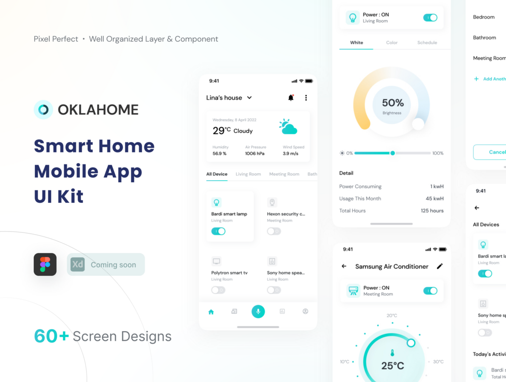 Oklahome is a high-quality UI Kit for smart home mobile applications. It provides all the essential features of a smart home app. This UI Kit is ready to be developed and customized. Important parts like illustrations, icons & graph stats have been included.