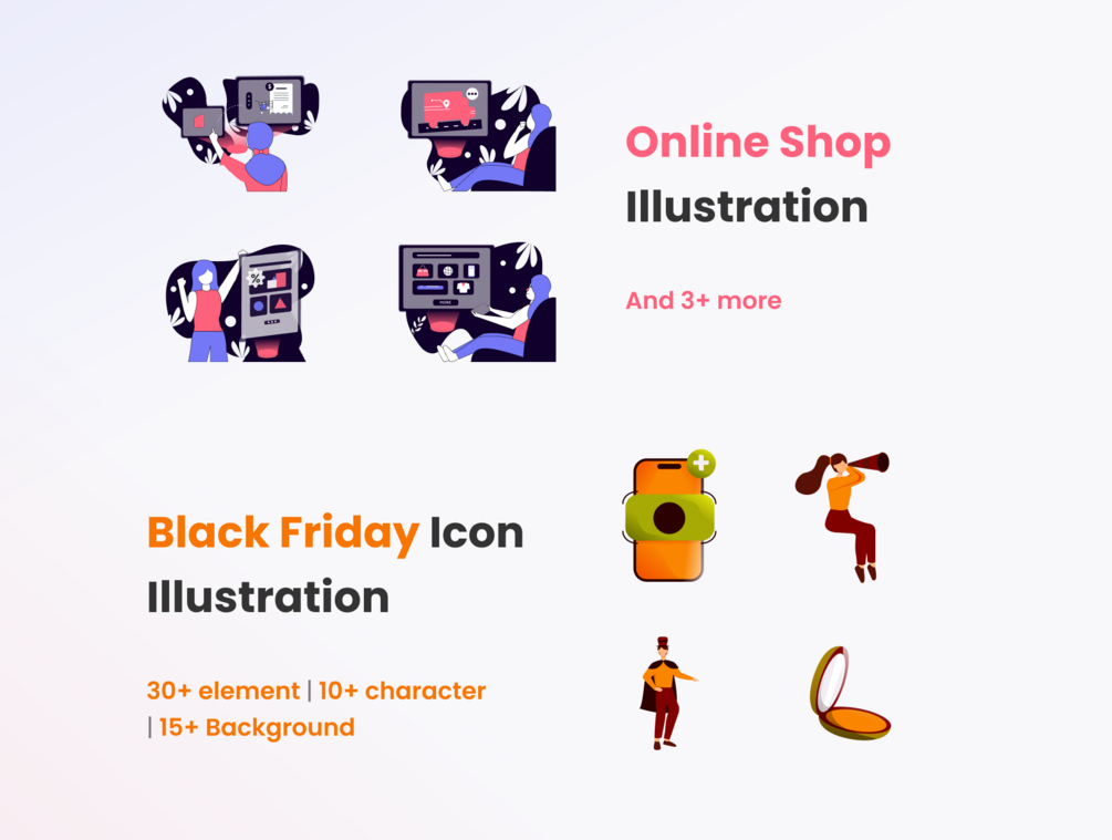- Online Shop Black Friday Illustration Set; Gear up for Black Friday with exclusive 2D illustration pack designed specifically for online shops. Full Preview