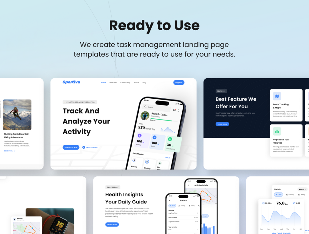 Sportiva is a Landing page kit for digital product services, majorly providing works in sports mobile app digital products in various innovative. Sportiva offers customized strategies, expert guidance, and strategic solutions tailored to represent sports activity across diverse digital product business activities.