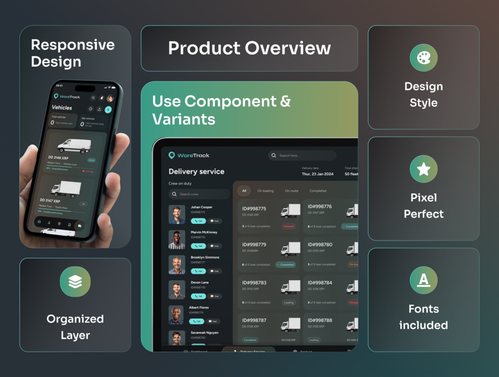 🧰 Well-organized and Ready to Use: Dive into hassle-free customization with symbols and components that are meticulously organized and ready to use. Whether using Figma, Sketch, or Lunacy, WareTrack is versatile and user-friendly.