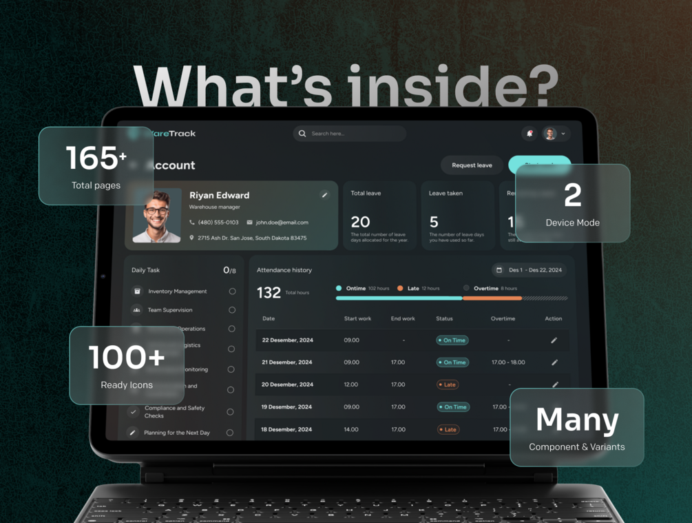 💻 Pre-Designed Template: Save time and speed up the desktop, mobile, and website app creation process with 165+ pre-designed screens. Effortlessly bring your desktop, mobile, and website app to life with WareTrack’s thoughtfully crafted templates.