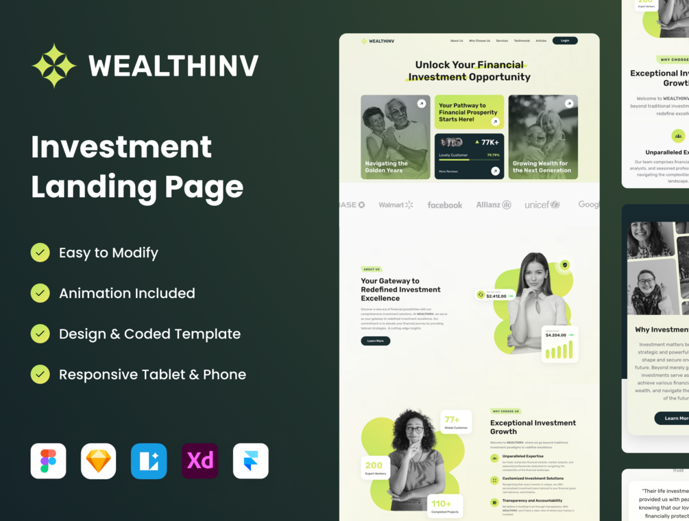 Available in both Pre Designed Template and Framer Template, WealthInv tailored to meet the needs of investment service, as well as both startups and established organizations operating in the insurance industry. The template is 100% customizable & fully responsive to look beautiful on all devices.