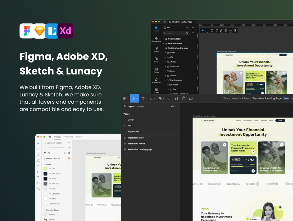 ๐Ÿงฐ Well-Organized and Ready to Use: Dive into hassle-free customization with symbols and components that are meticulously organized and ready to use. Whether you're using Figma, Sketch, Adobe XD, or Lunacy, WealthInv is versatile and user-friendly.