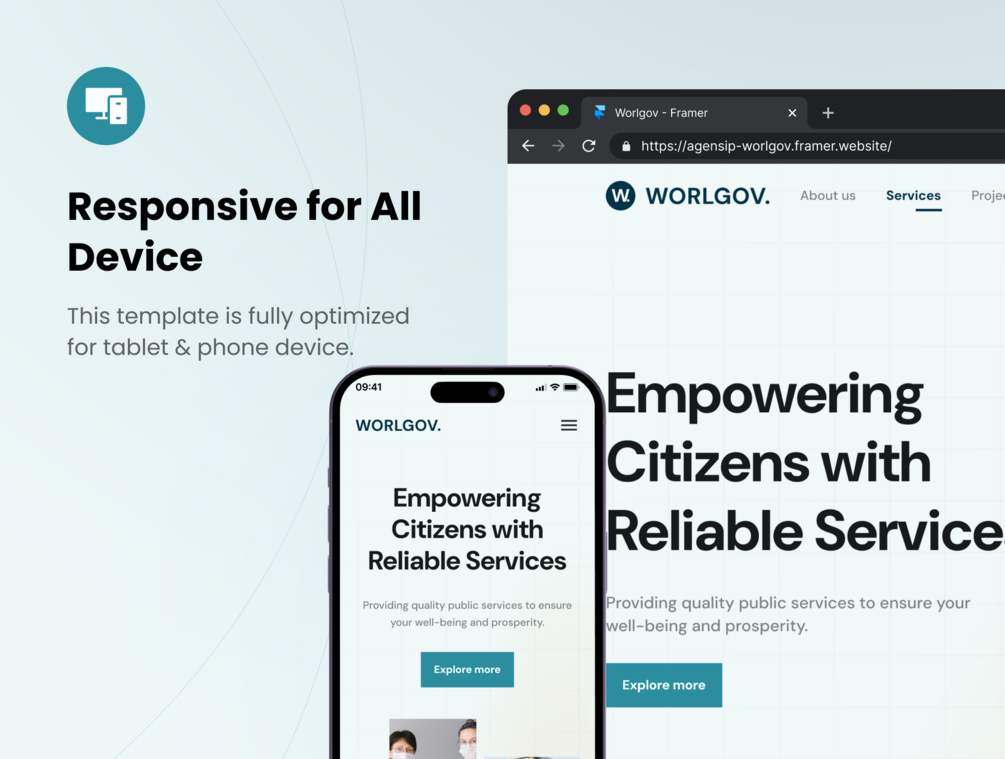 WorlGov is a clean and modern Framer template tailored to provide work for public services such as displaying information like events and news, ongoing government projects, and many public services in various innovative. The template is made for Framer and is 100% customizable & fully responsive to look beautiful on all devices.